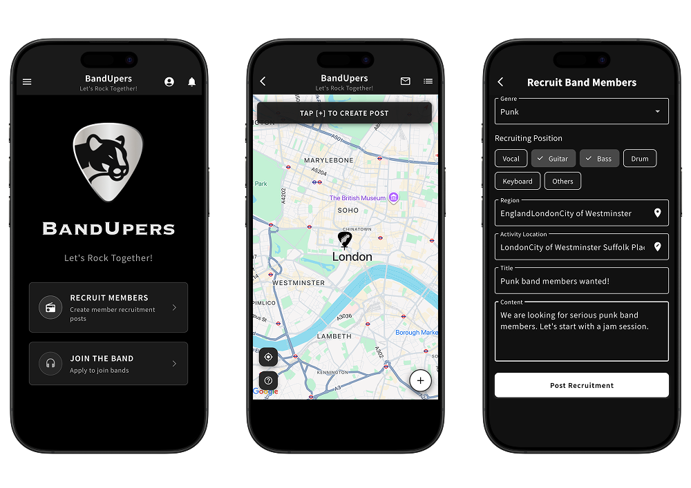 BandUpersは、地図を使って簡単にバンドメンバーを募集・応募できるアプリです。