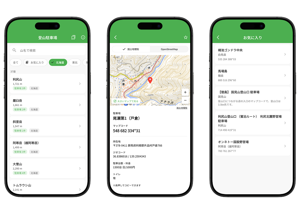 "Trailhead Parking Map Code Search" is an app that lets you instantly find map codes for trailhead parking lots across Japan. Many trailhead parking areas don't have registered addresses or phone numbers, making them difficult to search for on car navigation systems. With this app, you can search for parking by mountain name or region and copy the map code with a single tap. It also supports favorites, offline viewing, and integration with map apps.